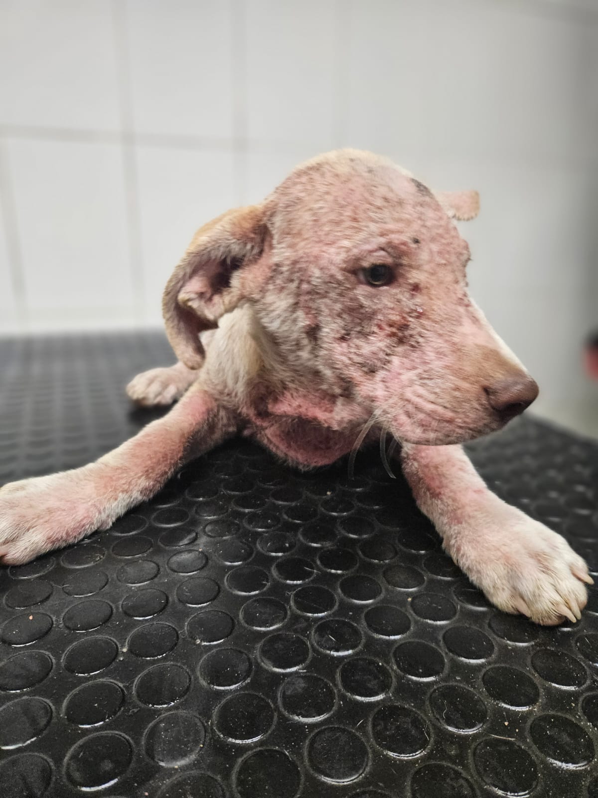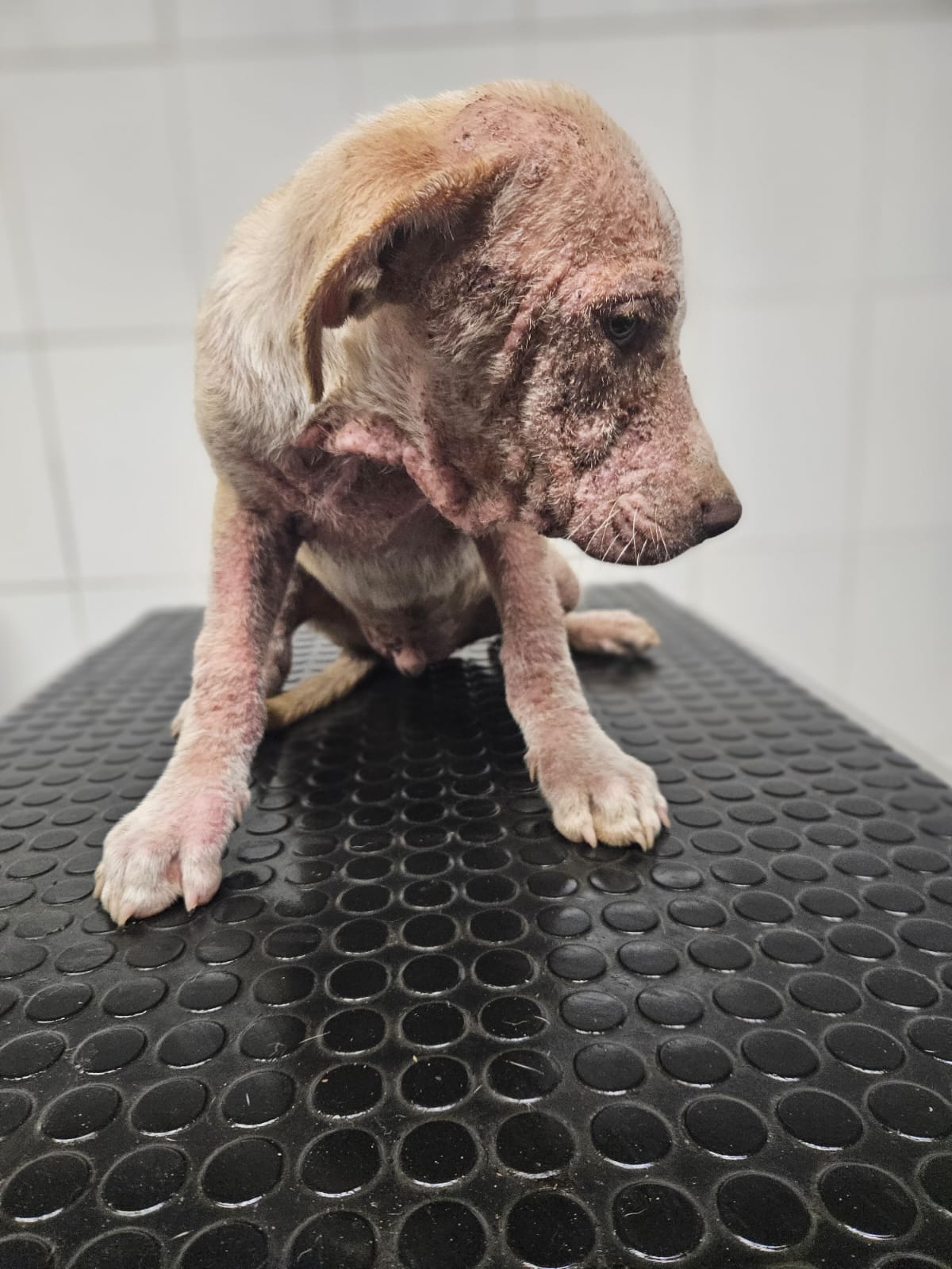 11.09.2025 hlásený psík v Gerlachove. KOKSO vek cca 4-4,5 mes, generalizovaný demodex, zapálená a zhutnená koža, zapálené oči.
