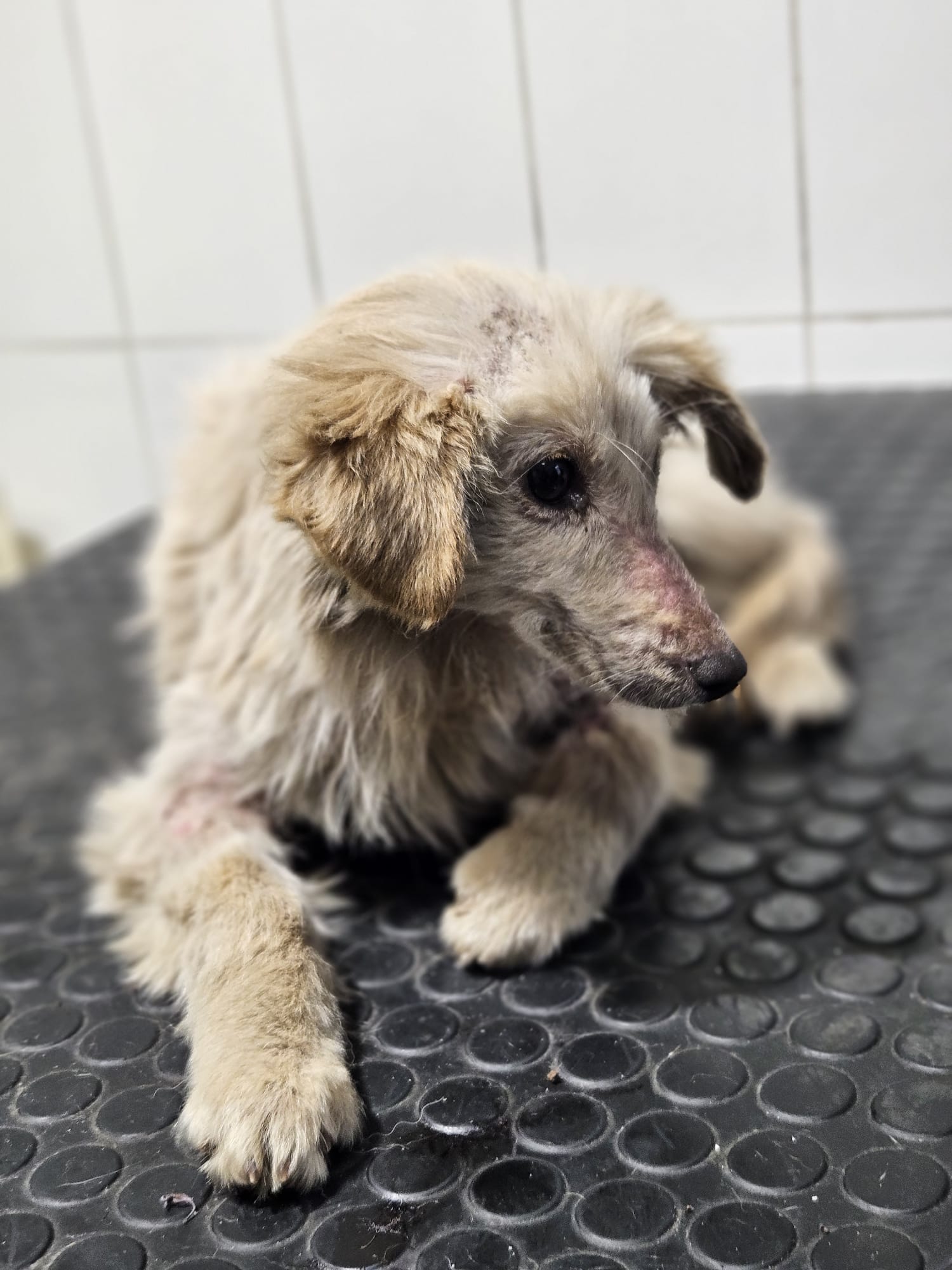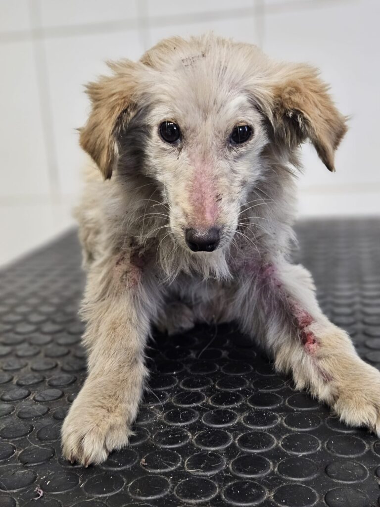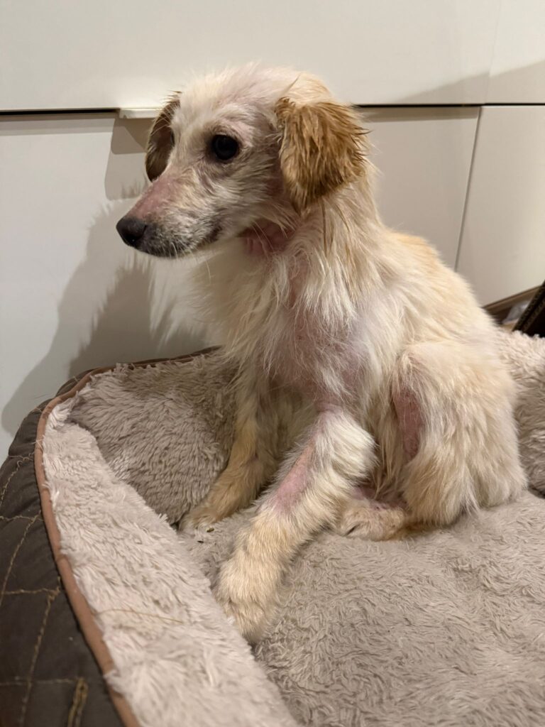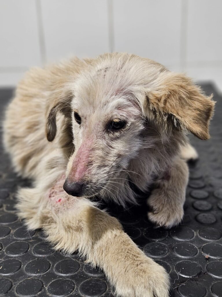 Cinka má demodex ( potvrdený mikroskopicky ), zápal kože, prišla dehydratovaná a veľmi hladná. Je ošetrená, začipovaná a začalo sa s liečbou.